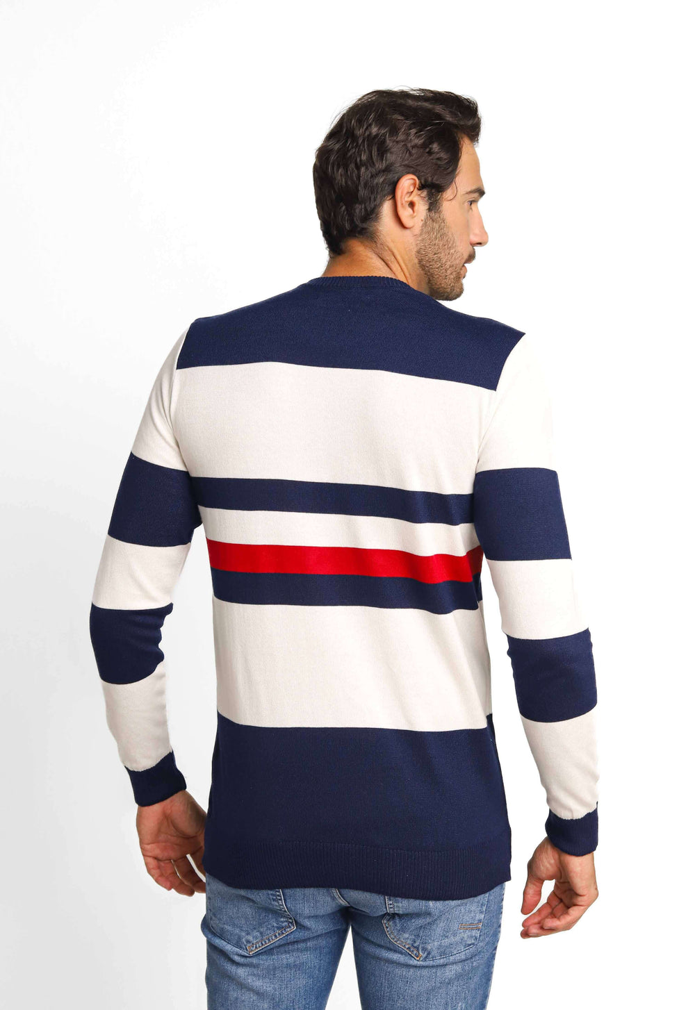 Suéter masculino com padronagem listrada e visual moderno, ideal para composições casuais com identidade.